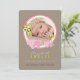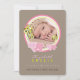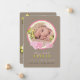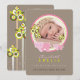 Esta ilustración original y caprichosa presenta líneas y formas simples. Representa a un grupo familiar de 2 elefantes (un padre o madre y su cría) paseando por un bosque con árboles estilizados que decoran un marco circular simple sobre una foto de su bebé recién nacida.