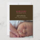 Subestimado y elegante, este sofisticado anuncio de nacimiento deja que la foto de su bebé sea el principal foco. El nombre de su bebé se define en negrita y de forma gratuita con las estadísticas de nacimiento que aparecen a continuación. Comparte tus noticias especiales con familiares y amigos con estas tarjetas de invitación para bebés.
