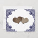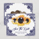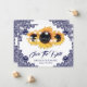 Navy blue and sunflower wedding save the date card featuring sunflower flowers, delicate floral lace, string lights and burlap hearts.