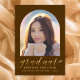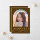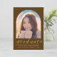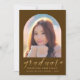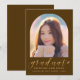 Envía a tu familia y amigos una tarjeta de anuncio de graduación de foto personalizada única para el 2025 para impresionarlos. Este diseño de plantilla moderna presenta una foto en un marco en arco para que la cambies por la tuya en un fondo marrón. Debajo de tu foto está la palabra "Graduado" en tipografía moderna de escritura a mano con script dorado falso y tu nombre, escuela secundaria y año para personalizar. Diseñado por Susan Coffey.