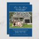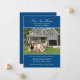 La invitación es sencilla y elegante, y en ella se incluye el título de personalizado "Nuestro nuevo hogar" en escritura, la foto de su nuevo hogar enmarcado en un borde rayado de alfileres, texto personalizado en blanco y un color de fondo azul zafiro real. Hay otros colores disponibles en la tienda Plush Paper y bajo petición.