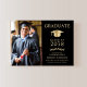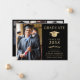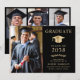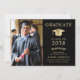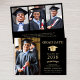 Elegante invitación de graduación de la universidad negra con una gorra de oro, la foto del graduado, su nombre en la tipografía clásica de los séricos de oro, y su escuela, especialidad, honores o planes futuros. En la parte posterior, agregue 3 fotos adicionales y su mensaje de invitación personalizado.