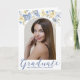 Suaves flores de color azul aciano y amarillo claro en acuarela decoran esta delicada y femenina tarjeta de anuncio de graduación plegada para su chica mayor. Personalice con una foto de retrato bajo el arco blanco con flores primaverales en la parte frontal y una segunda fotografía horizontal completa en el interior para un estudiante de secundaria o universidad.