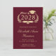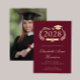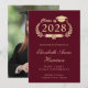 Moderna invitación de graduación universitaria de color rojo burdeos que presenta "Clase de" en un ilustracion dorado claro de una corona de laurel con topper y diploma de tapa de grado y el nombre del graduado en un elegante guión dorado claro. Añada su escuela, su escuela principal, honores o planes futuros. Su foto llena la parte trasera de la tarjeta.