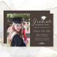 Envía a tu familia y amigos una tarjeta de graduación de fotos personalizada única que incluye tu foto de personalizado a la izquierda y a la derecha una gorra blanca de grado con la palabra "Graduado", clase/año, nombre y otros detalles de la ceremonia en caligrafía de escritura blanca formal para personalizar en un fondo marrón. Diseñado por Susan Coffey.