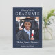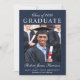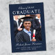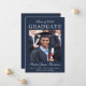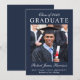 Anuncio de graduación universitaria simple y elegante en azul oscuro con una foto del graduado, su nombre y año de graduación en letra cursiva blanca y su universidad, especialidad y honores en tipografía blanca moderna.