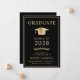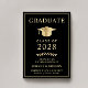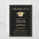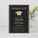 Anuncio de graduación universitaria negra elegante con una gorra de graduación dorada y tipografía dorada moderna y simple para el nombre del graduado, año de graduación, universidad o institución, título y especialidad o honores.