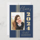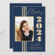 Esta elegante invitación de graduación de la Clase 2024 presenta bandas doradas, marco fotográfico y texto en un fondo azul marino.