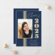 Esta clase de 2025 elegante y elegante invitación de graduación universitaria incluye rayas de oro, marco fotográfico y texto sobre un fondo azul marino.