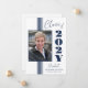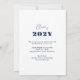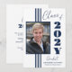 Clase de 2025 elegante invitación de graduación elegante con franjas azul marino, marco fotográfico y texto sobre un fondo blanco.