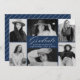 Elegante invitación de graduación con 6 fotos que bordean el diseño. "Graduado" se muestra en un guión blanco moderno de caligrafía sobre un fondo azul marino. Personalice la parte delantera de la invitación de graduación fotográfica agregando el nombre del graduado, la escuela y el año de graduación. La invitación se invierte para mostrar un patrón de banda diagonal marina y blanca. La invitación de graduación con fotos múltiples es perfecta tanto para graduados de secundaria como universitarios.