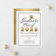 Anuncia tu graduación con estilo con esta elegante tarjeta de anuncio personalizada que incluye las palabras "Clase Graduada 2025" con tu nombre, escuela y fecha para personalizar en oro y blanco con un gorro de graduado dorado sobre fondo blanco. Diseñada por Susan Coffey.