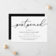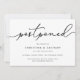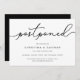 ¿Necesita posponer a su boda o cambiar la fecha? Infórmele a los huéspedes con estas simples y elegantes tarjetas de invitación de aplazamiento de bodas. Moda características de diseño en blanco y negro "pospuestas" en la parte superior de la escritura caligráfica con letras a mano, con sus nombres y nueva fecha debajo. Ajustar la redacción y el nivel de detalle según sea necesario. Como se muestra, el texto de ejemplo dirige a los invitados a su sitio web boda para obtener más información.