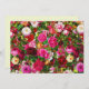 El colorido jardín con arbustos rosas y otras flores está en plena floración.