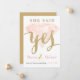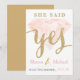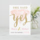 Tarjeta de invitación de 5x7 con frente semi brillante y dorso mate. La parte frontal tiene un diamante rosa con letras doradas brillantes que dicen, "Ella dijo Sí".