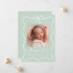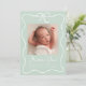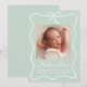 Bienvenido a tu bebé con este dulce anuncio de nacimiento con un suave fondo verde menta acentuado por un delicado marco de arco blanco y cinta de correr. La foto de su bebé se muestra bellamente en el centro, con su nombre mostrado en negrita y blanco y detalles de nacimiento cuidadosamente arreglados abajo. Este diseño personalizado combina tonos suaves y refrescantes con una elegancia intemporal, perfecta para compartir sus alegres noticias con la familia y los amigos.