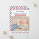 La tarjeta de anuncio de nacimiento con foto de estilo vintage presenta un encabezado de letra "Entrega Especial" con el nombre del bebé en negrita serif, estadísticas de nacimiento en una pancarta de cinta roja y un sello de matasellos "Nuestro Niño Ha Llegado". Las rayas diagonales clásicas rojas, blancas y azules destiñidas enmarcan el diseño con un mensaje "Recibido con Amor" debajo. La parte posterior continúa el patrón de rayas de correo aéreo. Todo el texto y los colores son totalmente personalizables.