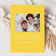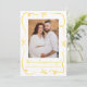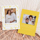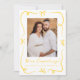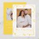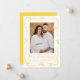 Comparte tu alegre noticia con esta alegre invitación de embarazo que muestra tu foto vertical en la parte delantera, enmarcada con cintas amarillas dibujadas a mano y arcos en un fondo blanco. Un guión amarillo escrito a mano "¡Estamos esperando!" se empareja con la fecha de vencimiento de su bebé y los nombres que hay debajo. La parte trasera incluye espacio para una foto horizontal y un mensaje personalizado, lo que la convierte en una forma brillante y neutral en cuanto a género para anunciar su embarazo.