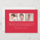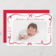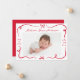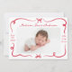 Bienvenido a tu pequeño con este encantador anuncio de nacimiento, con cintas rojas hechas a mano y arcos enmarcando la foto horizontal de tu bebé en el frente. El nombre y las estadísticas de nacimiento de su bebé se resaltan en un elegante guión escrito a mano. La parte de atrás muestra un collage de 3 fotos con espacio para el mensaje de su personalizado debajo. El rico diseño rojo es perfecto para los anuncios de nacimiento de los Navidades, las llegadas de San Valentín o cualquier temporada en la que quieras compartir tu alegría con estilo.