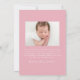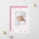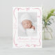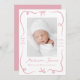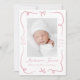 Celebre la llegada de su bebé con este dulce y elegante anuncio de nacimiento, diseñado con arcos y cintas pintadas a mano color rosa que enmarcan la foto vertical de su bebé en el frente. El nombre y las estadísticas de nacimiento de su bebé aparecen en un elegante guión escrito a mano. La parte trasera incluye una foto horizontal con espacio debajo para tu mensaje personalizado, perfecto para compartir una nota de agradecimiento o un sentimiento especial con los seres queridos. Una encantadora elección para las niñas.