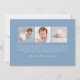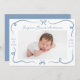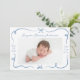 Celebra la llegada de tu bebé con este dulce anuncio de nacimiento que incluye polvorientas cintas azules hechas a mano y arcos que enmarcan la foto horizontal de tu bebé en el frente. Personalice el nombre y las estadísticas de nacimiento de su bebé en un encantador guión escrito a mano. La parte posterior muestra un collage de 3 fotos con espacio para un mensaje personalizado. Este diseño azul suave es perfecto para niños o cualquier familia que busque un anuncio de nacimiento clásico y atemporal.