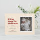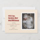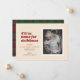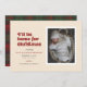 Esta invitación temática de embarazo de los Navidades incluye las palabras "Voy a ser el hogar de los Navidades" escritas en una letra de estilo retro rojo. Tiene espacio para una foto de un solo retrato así como el nombre y estadísticas de nacimiento de un recién nacido. La parte de atrás tiene un estampado rojo y verde festivo.