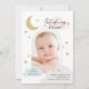 Un diseño de anuncio de nacimiento lúdico pero elegante que presenta tu foto en forma de arco con un guión de caligrafía elegante y estrellas dibujadas a mano, nubes y una luna creciente. En la parte trasera hay un collage de 3 fotos y más estrellas. Asegúrese de visitar la colección para ver más.