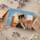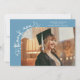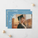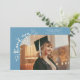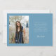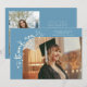 Tarjeta de anuncio de graduación extravagante y caprichosa con una foto en la parte frontal y otra en la parte trasera. El texto dice "gracias" con letra extravagante y estrellas y confeti. Agregue el nombre del graduado, información y mensaje para personalizar esta tarjeta. Azul denim.