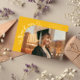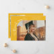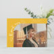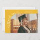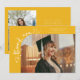 Tarjeta de anuncio de graduación extravagante y caprichosa con una foto en la parte frontal y otra en la parte trasera. El texto dice "gracias" con escritura extravagante con estrellas y confeti. Agregue el nombre del graduado, información y mensaje para personalizar esta tarjeta. Amarillo.