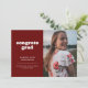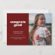 Anuncia el gran logro de tu graduado con esta tarjeta de graduación sencilla pero elegante. Cuenta con las palabras "felicitaciones graduado" en una fuente retro blanca sobre un fondo rojo oscuro, así como espacios para una foto en el anverso y el reverso. El reverso de la tarjeta también tiene espacio para una nota personal sobre el graduado, incluyendo planes futuros.