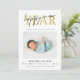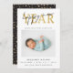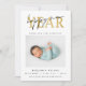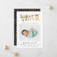 Elegante y moderna tarjeta de anuncio de nacimiento de Año Nuevo. El diseño presenta una foto única del bebé, guión feliz de año nuevo en letras modernas, estadísticas de nacimiento, nombre, mensaje y patrón de puntos de polka oro festivo en la parte posterior de la tarjeta. ¡La manera perfecta de anunciar el nacimiento de su bebé y desear a todos un feliz Año Nuevo!