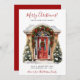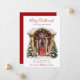 Esta acuarela Feliz Navidad nuevo hogar para las vacaciones tarjeta de invitación con una puerta de entrada roja decorada de forma festiva con arbustos de pino y árboles, una corona y arcos rojos de vacaciones sería perfecto para mandar a tus amigos y familia ahora que te has mudado a una nueva casa. El sentimiento es personalizable. Consigue lo suficiente para que todos los que conoces y amas tengan tu nueva dirección. ¡Estarán tan emocionados por tu gran movida!