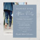 Elegante anuncio de boda o elopement en azul polvoriento o invitación de fiesta de recepción de boda y celebración. La parte delantera presenta "Fiesta Feliz Después" en una mezcla de tipografía blanca simple y un guión blanco moderno, y puede personalizar su mensaje e invitación con más detalle y agregar sus nombres en un guión similar a una firma. La parte posterior presenta su foto de boda favorita, sus primeros nombres y fecha de boda.