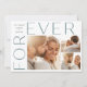 Una elegante tarjeta de invitación de compromiso de collage de fotos con tres fotos (una cuadrada y dos horizontales), con "FOREVER" en letras modernas a lo largo de la parte superior e izquierda. Personalice el mensaje de su personalizado (mostrado con "¡estamos comprometidos!") y sus nombres.