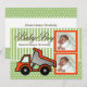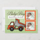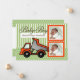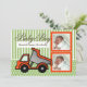 Anuncio de nacimiento de bebé adorable con camiones volquete, rayas y lunares en verde y naranja para su nuevo bebé niño. Personalizable con dos fotos. Mucho espacio para texto en la parte posterior.