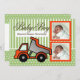 Anuncio de nacimiento de bebé adorable con camiones volquete, franjas y lunares en verde y naranja para su nuevo bebé niño. Personalizable con dos fotos. Mucho espacio para texto en la parte posterior.