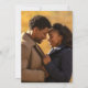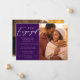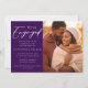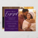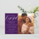 Esta simple tarjeta de anuncio de compromiso de pareja púrpura real con fondo sólido presenta una elegante escritura blanca para una boda en una noche de invierno. Invitaciones de fiesta de compromiso con tipografía minimalista y una segunda fotografía en la parte posterior.