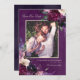 Flores románticas en tonos de burgundy intenso, lila suave, morado berenjena profundo y orquídea rosada se combinan con elementos botánicos verdes modernos como helechos y eucalipto. Un fondo de acuarela de un morado berenjena profundo lo une todo con tipografía moderna elegante en estas tarjetas de foto para guardar la fecha.