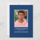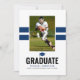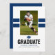 Tarjeta de invitación para graduación de niños moderna con 2 bandas de deportes azul marino, 2 fotos del graduado (una de las dos caras), un motarboard y una plantilla de texto que es fácil de personalizar.