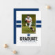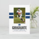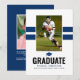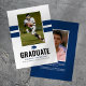 Tarjeta moderna de anuncio de graduación para niños con 2 franjas deportivas de color azul marino, 2 fotos del graduado (una a cada lado), una birrete y una plantilla de texto fácil de personalizar.