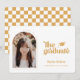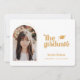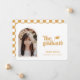Invitación fotográfica de graduación tipo retro. Características, foto de marco de un solo arco, acento de tapa de grad, tipografía retro en amarillo vintage rústico y soporte de patrón de damero de coordinación.