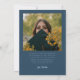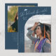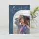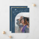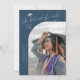 Tarjeta de foto de anuncio de graduación moderna y caprichosa con una foto curva en la parte frontal y 1 en la parte trasera. El texto dice "Ella creyó que podía, así que lo hizo" con estrellas dibujadas a mano y una gorra de graduación. Agregue el nombre de la graduada, información y mensaje para personalizar esta tarjeta. Fondo azul marino.