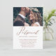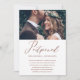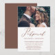 Elegante anuncio de cambio de fecha de bodas pospuesta. Este simple anuncio es una forma elegante de hacer saber a los invitados que la fecha de su boda ha sido reprogramada debido a circunstancias imprevistas, e incluye la nueva fecha de la boda. Este anuncio de moda presenta una hermosa caligrafía de "pospuesto" en cobre falso sobre un fondo blanco con la foto de la pareja, y una parte posterior de la tarjeta de color marrón cobre.