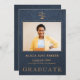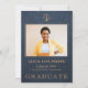 Moderna y elegante apariencia de cuero azul marino oscuro y invitación de la tarjeta de graduación de la escuela de derecho oro de cobre con escala de justicia, foto de su personalizado y texto.