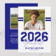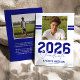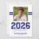 Anuncie un hito importante con esta moderna tarjeta de graduación masculina. Con un elegante fondo blanco, la parte delantera muestra una foto cuadrada del graduado acentuada por dos franjas azules deportivas que recorren el fondo para darle un toque audaz y atlético. Un fuerte título de "Graduado 2026" se combina con el nombre del graduado y la escuela, universidad o institución a la que asistió.