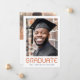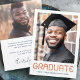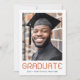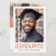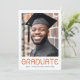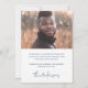 Tarjeta moderna de invitación de graduación con tu foto y el texto "graduado" con una letra moderna con el año y el nombre de la escuela abajo. Foto adicional y mensaje de agradecimiento al personalizado en la parte de atrás. Texto azul oscuro sobre fondo blanco.