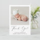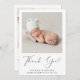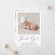 Anuncio mínimo de nacimiento de bebé o chica y tarjeta de agradecimiento con la foto de su recién nacido y "Gracias" en un guión elegante con un latido cardíaco. Personalice con su nombre, fecha de llegada y estadísticas de nacimiento en una simple tipografía moderna. Al revés, añade una foto adicional y tu invitación personalizada y mensaje de agradecimiento.