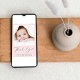 Anuncio de nacimiento de una bebé de color rosa mínimo y tarjeta de agradecimiento con la foto de su recién nacido y "Gracias" en un guión elegante con un latido cardíaco. Personalice con su nombre, fecha de llegada y estadísticas de nacimiento en una simple tipografía moderna. Al revés, añade una foto adicional y tu invitación personalizada y mensaje de agradecimiento.