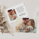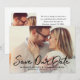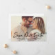 ¡Anuncien su cita de boda a la familia y amigos! Esta boda moderna, salvo el diseño de la tarjeta de invitación de fecha, incluye una foto horizontal de la pareja comprometida en el frente con un sobrepeso de escritura de caligrafía "Save our Date" (Salven nuestra fecha) cepillado negro y un monograma de nombres de novias y novios y fecha de boda que se puede personalizar. La parte posterior de la tarjeta incluye una segunda foto en formato vertical y texto negro sencillo que se puede personalizar con los detalles de su boda. Hay que destacar que los colores blanco y negro se pueden modificar.
