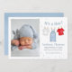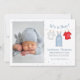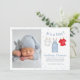 Presentar a su pequeño nunca ha sido más dulce con esta tarjeta de anuncio de nacimiento de niño. Con un diseño de diseño de foto de bebé minimalista, este diseño destaca las estadísticas de nacimiento de su recién nacido junto a una divertida cita "Es un niño". Adornada con overoles de mezclilla azul en una encantadora cuerda de ropa, la tarjeta combina tipografía caprichosa con un tema patriótico rojo, blanco y azul. Perfecta para padres nuevos, ¡es una forma divertida y creativa de compartir su alegría!